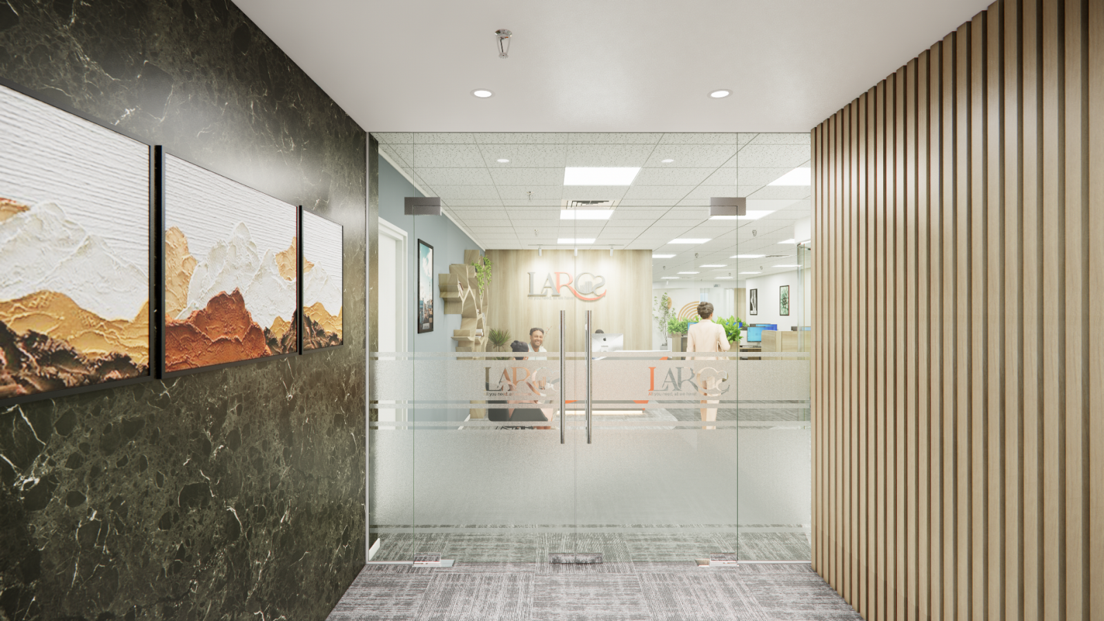 Vách ngăn kính cường lực: Tối đa hóa ánh sáng tự nhiên, tạo sự kết nối thị giác giữa các phòng ban mà vẫn đảm bảo tính cách âm cần thiết.